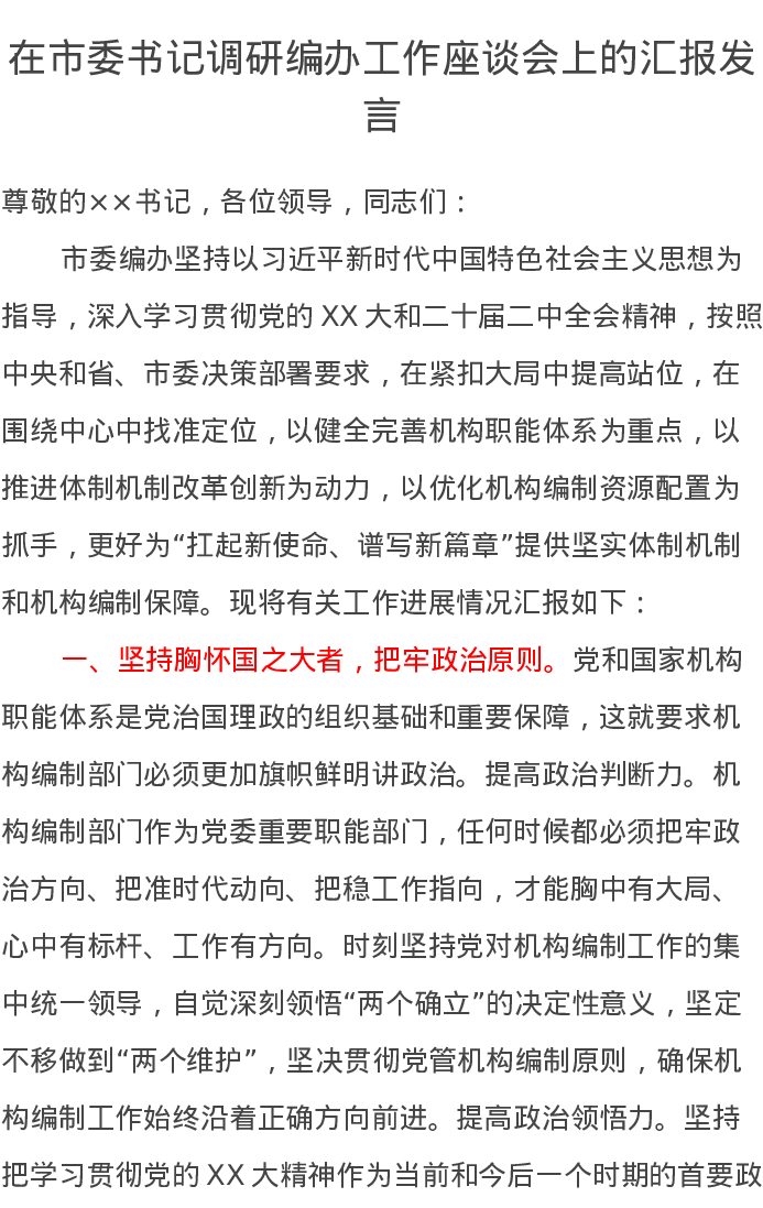 在市委书记调研编办工作座谈会上的汇报发言