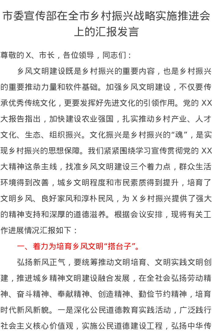 市委宣传部在全市乡村振兴战略实施推进会上的汇报发言
