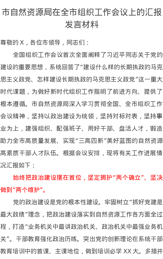市自然资源局在全市组织工作会议上的汇报发言材料