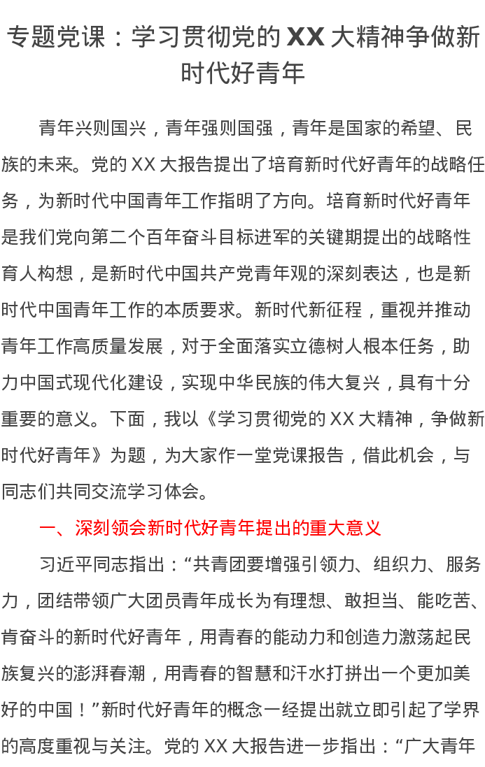 专题党课讲稿:学习贯彻党的二十大精神争做新时代好青年