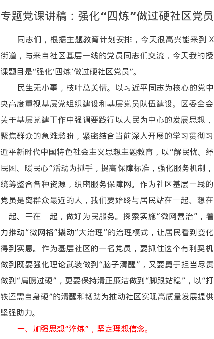 专题党课讲稿:强化“四炼”做过硬社区党员