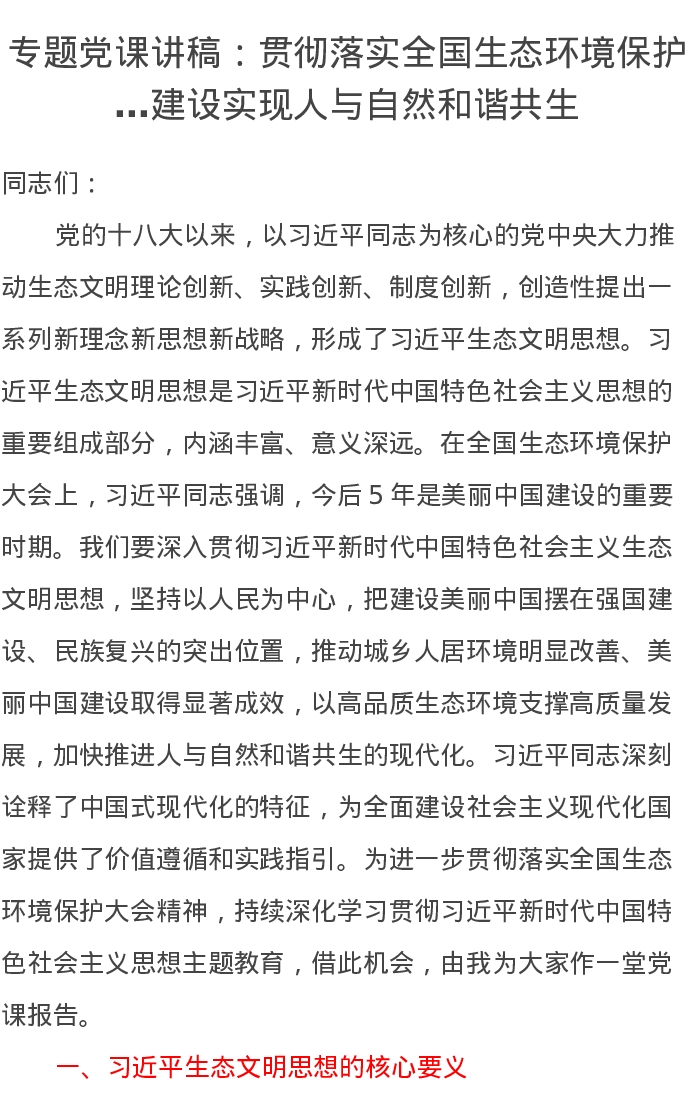 专题党课讲稿:贯彻落实全国生态环境保护…建设实现人与自然和谐共生