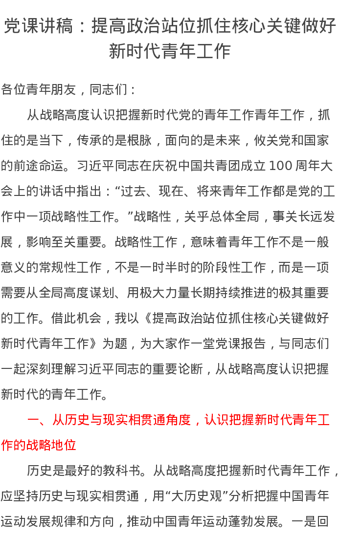党课讲稿:提高政治站位抓住核心关键做好新时代青年工作