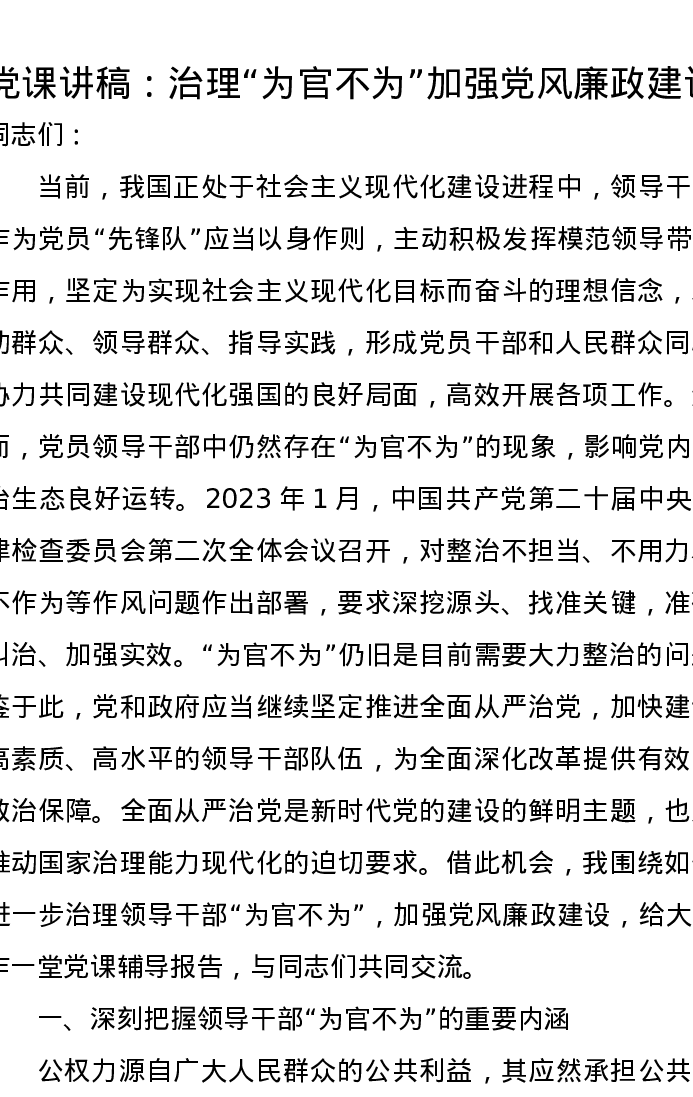 党课讲稿:治理“为官不为”加强党风廉政建设