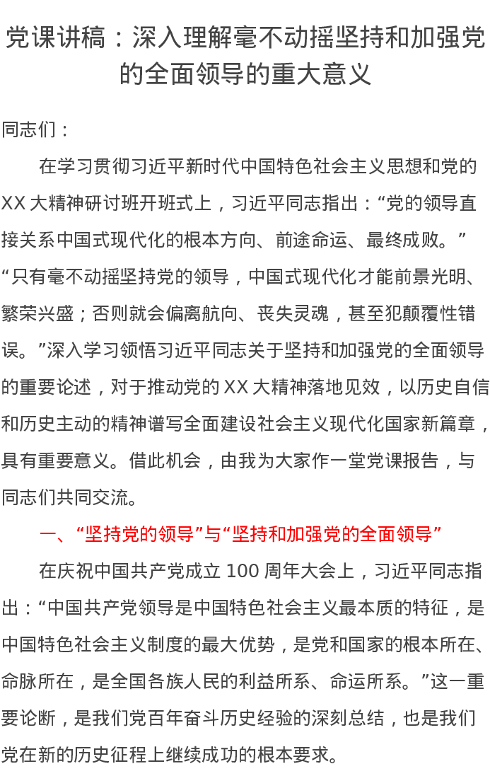 党课讲稿:深入理解毫不动摇坚持和加强党的全面领导的重大意义