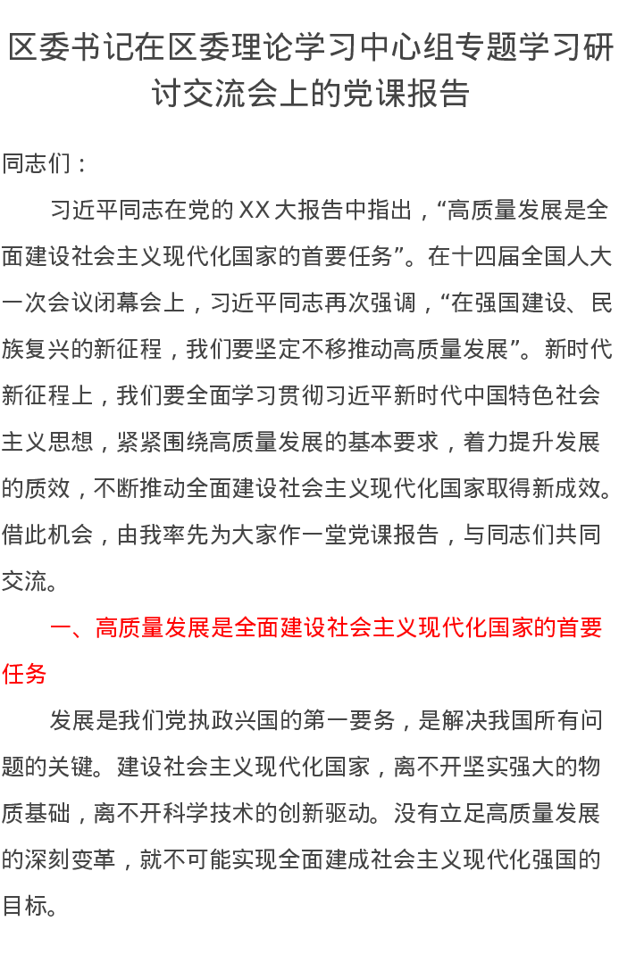 区委书记在区委理论学习中心组专题学习研讨交流会上的党课报告