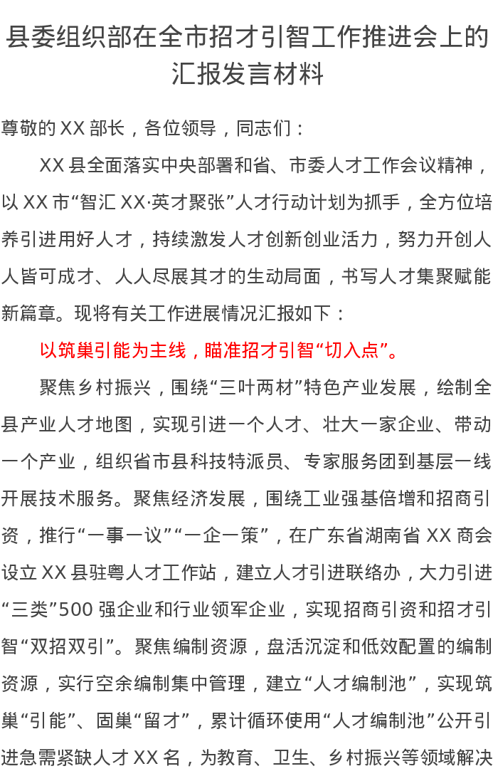 县委组织部在全市招才引智工作推进会上的汇报发言材料