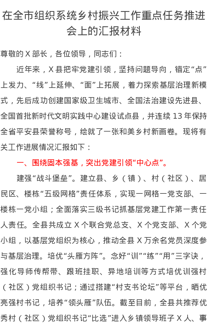 在全市组织系统乡村振兴工作重点任务推进会上的汇报材料