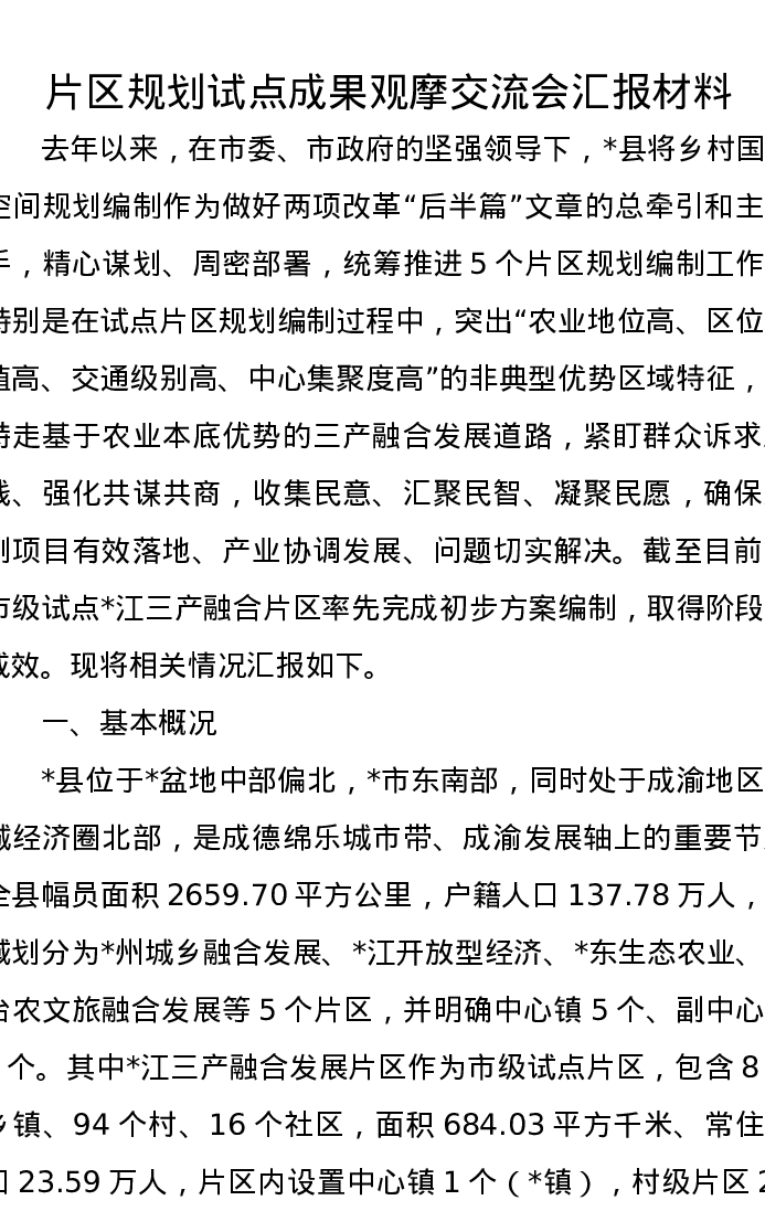 片区规划试点成果观摩交流会汇报材料