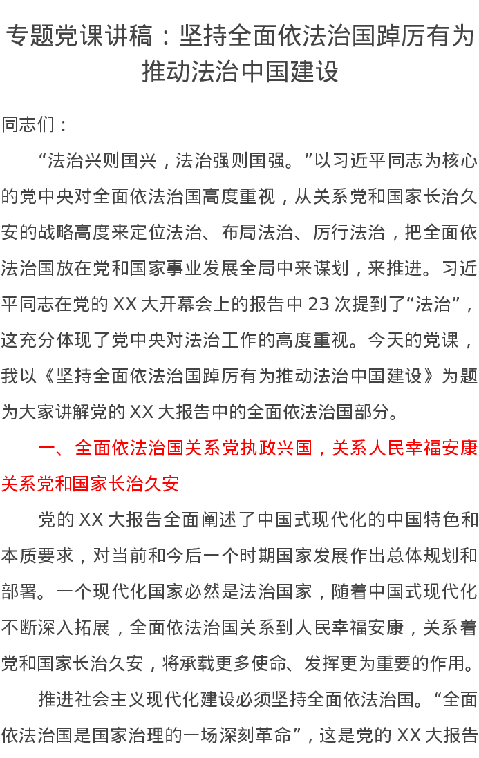 专题党课讲稿:坚持全面依法治国踔厉有为推动法治中国建设