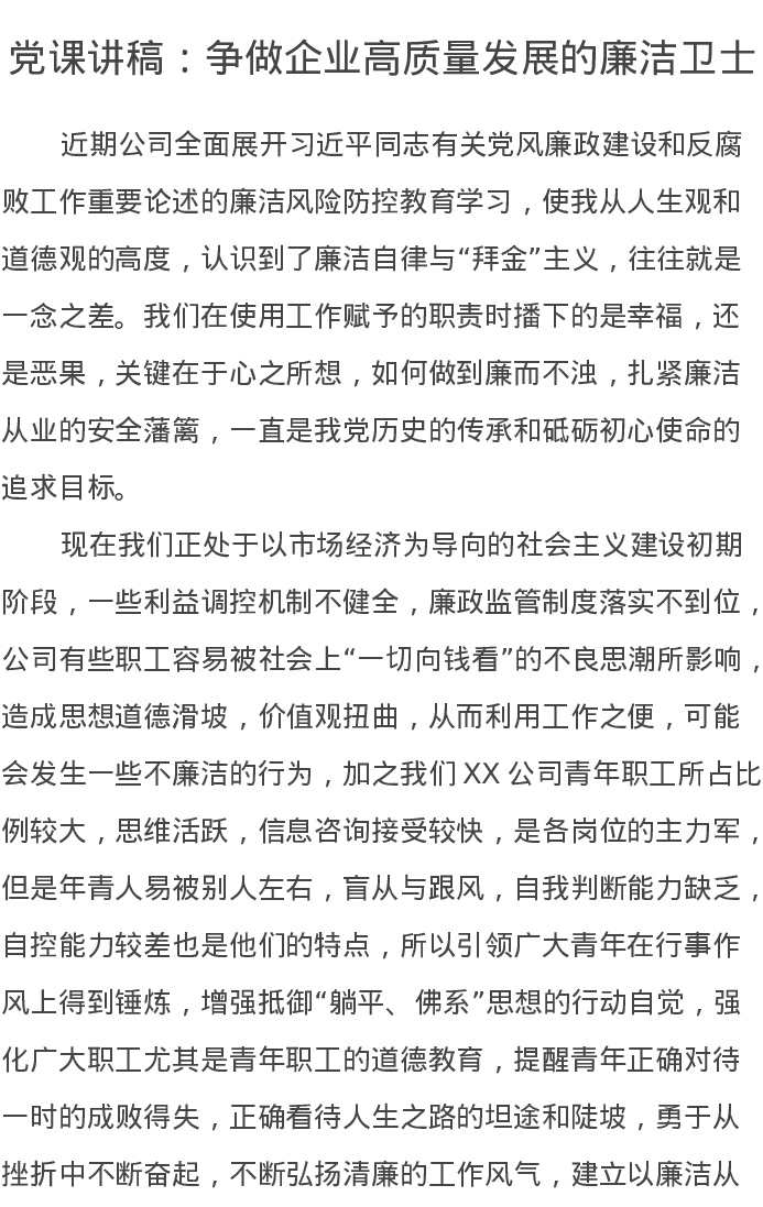 党课讲稿:争做企业高质量发展的廉洁卫士