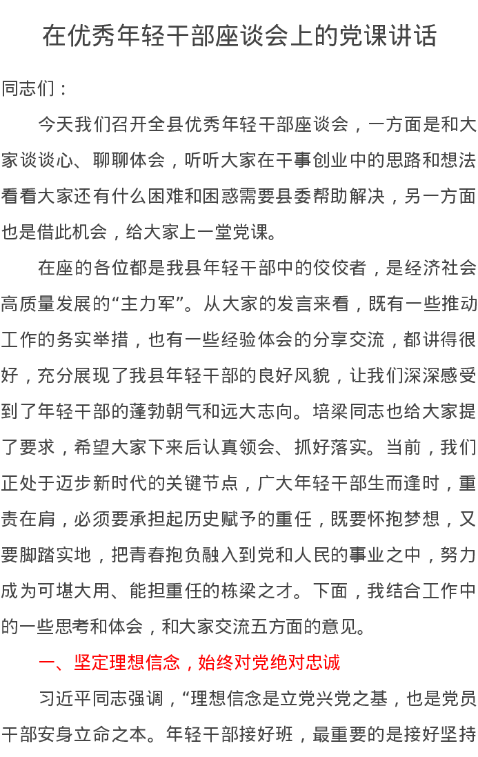 在优秀年轻干部座谈会上的党课讲话讲稿