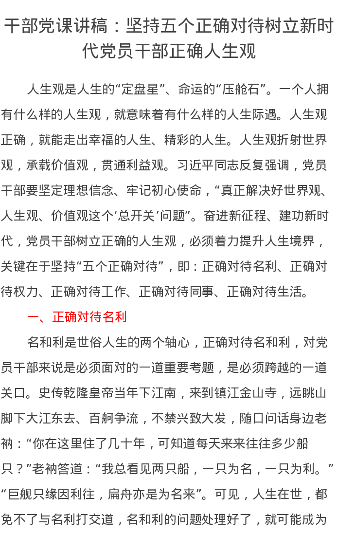干部党课讲稿:坚持五个正确对待树立新时代党员干部正确人生观