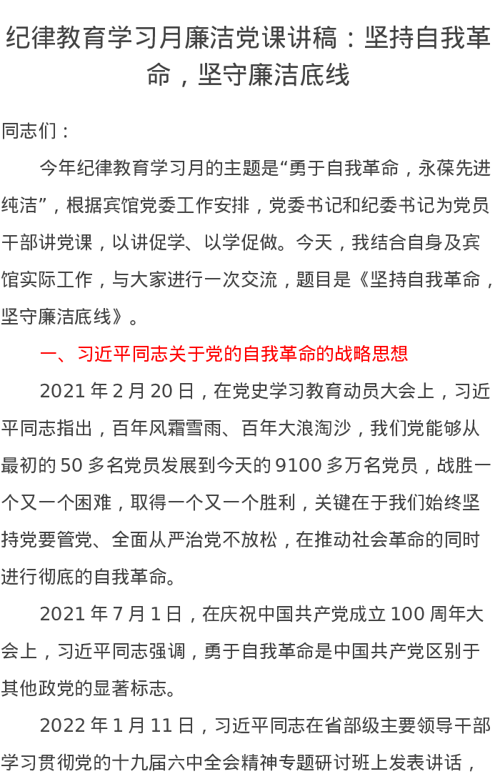 纪律教育学习月廉洁党课讲稿:坚持自我革命,坚守廉洁底线