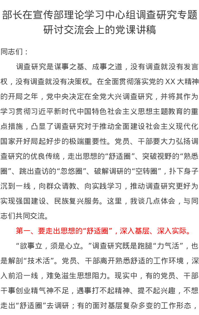 部长在宣传部理论学习中心组调查研究专题研讨交流会上的党课讲稿