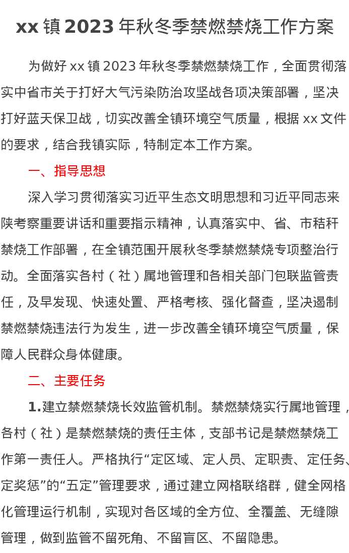 xx镇2023年秋冬季禁燃禁烧工作方案