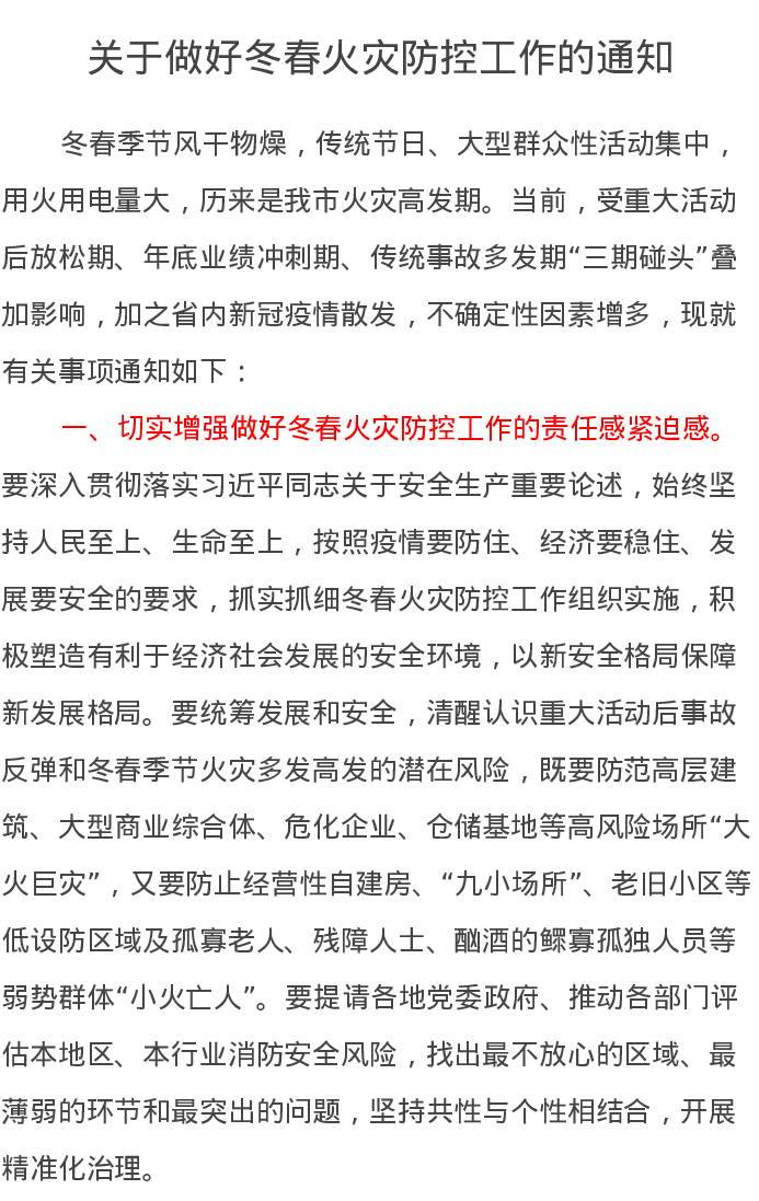 关于做好冬春火灾防控工作的通知