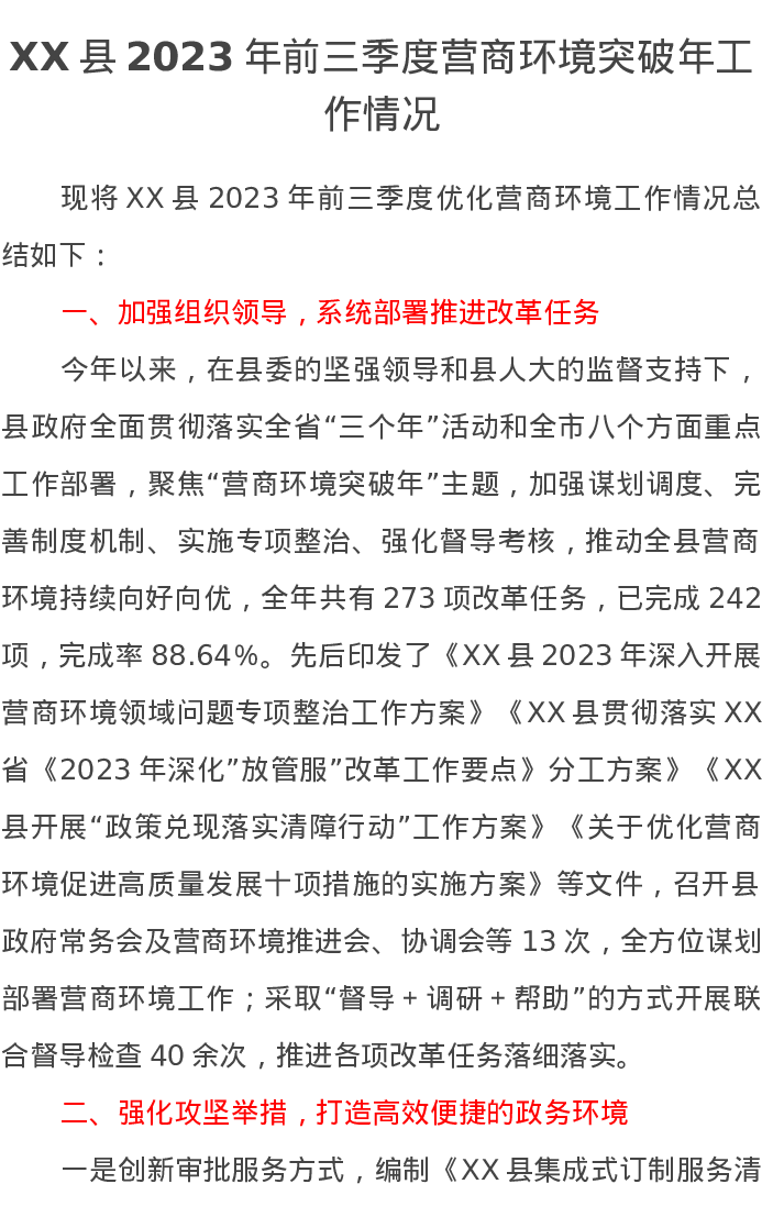 XX县2023年前三季度营商环境突破年工作情况汇报