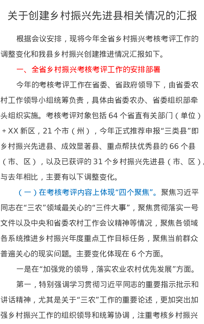 关于创建乡村振兴先进县相关情况的汇报