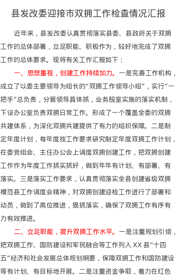 县发改委迎接市双拥工作检查情况汇报