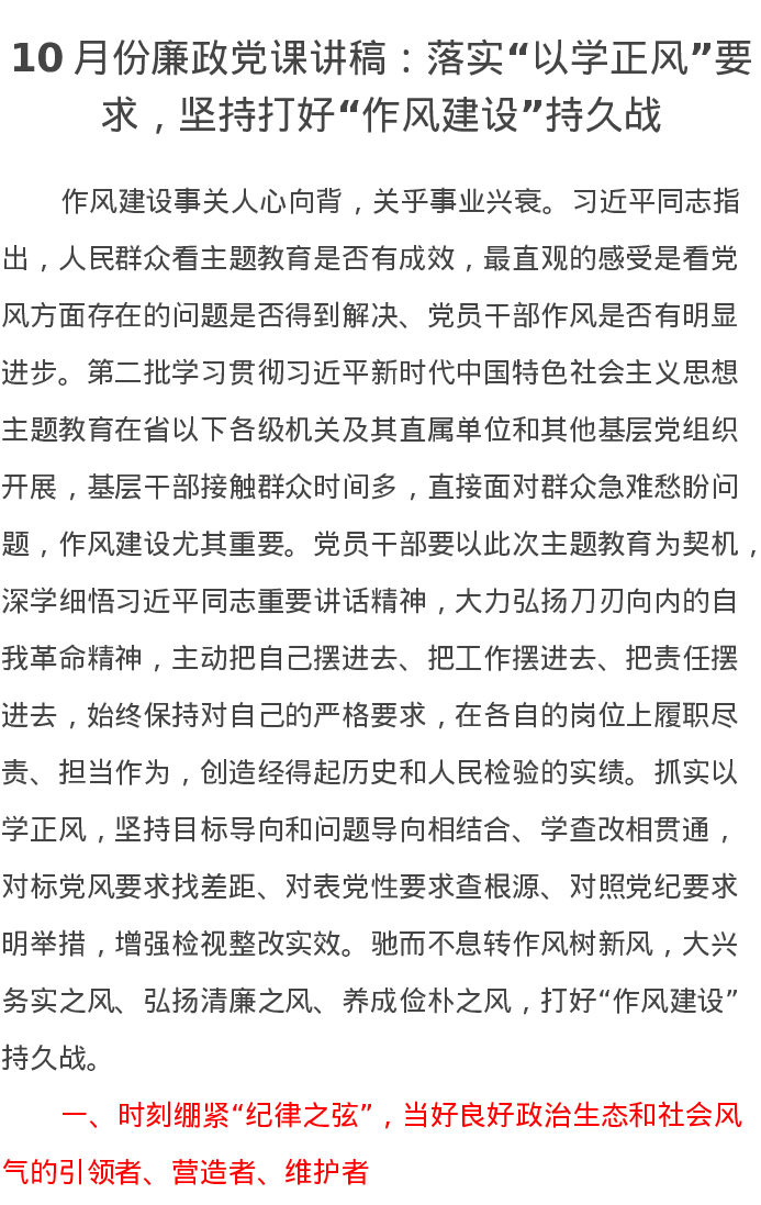 10月份廉政党课讲稿:落实“以学正风”要求,坚持打好“作风建设”持久战
