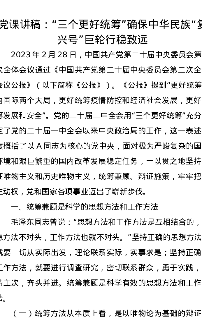 党课讲稿:“三个更好统筹”确保中华民族“复兴号”巨轮行稳致远