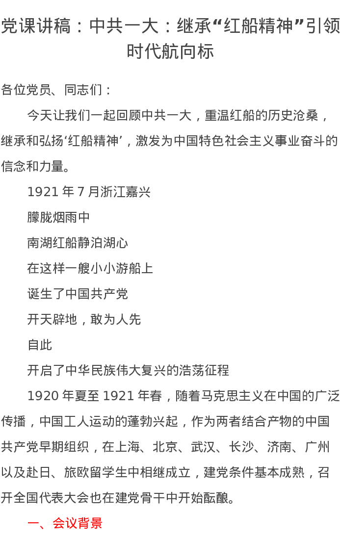 党课讲稿:中共一大:继承“红船精神”引领时代航向标