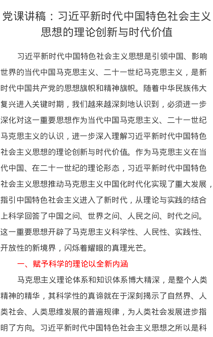 党课讲稿:习近平新时代中国特色社会主义思想的理论创新与时代价值