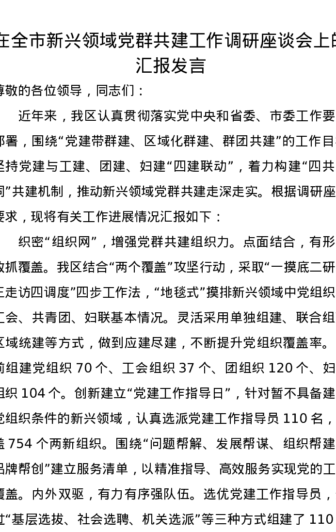 在全市新兴领域党群共建工作调研座谈会上的汇报发言