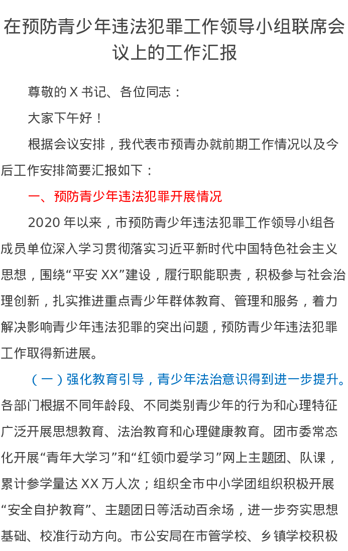 在预防青少年违法犯罪工作领导小组联席会议上的工作汇报