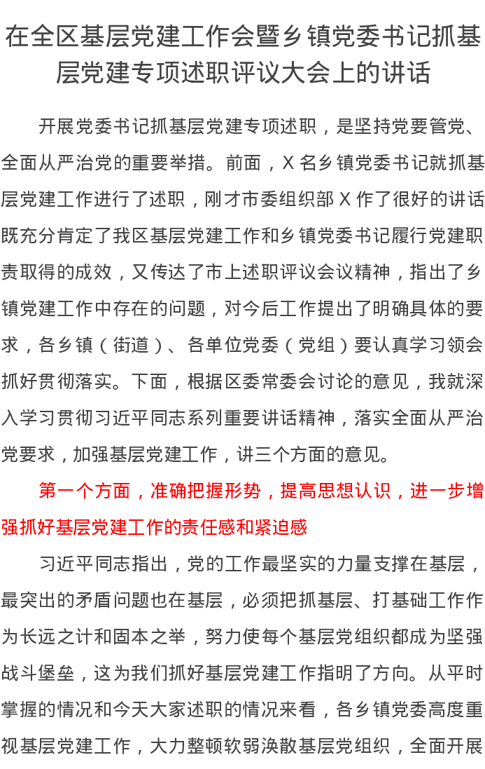 在全区基层党建工作会暨乡镇党委书记抓基层党建专项述职评议大会上的讲话