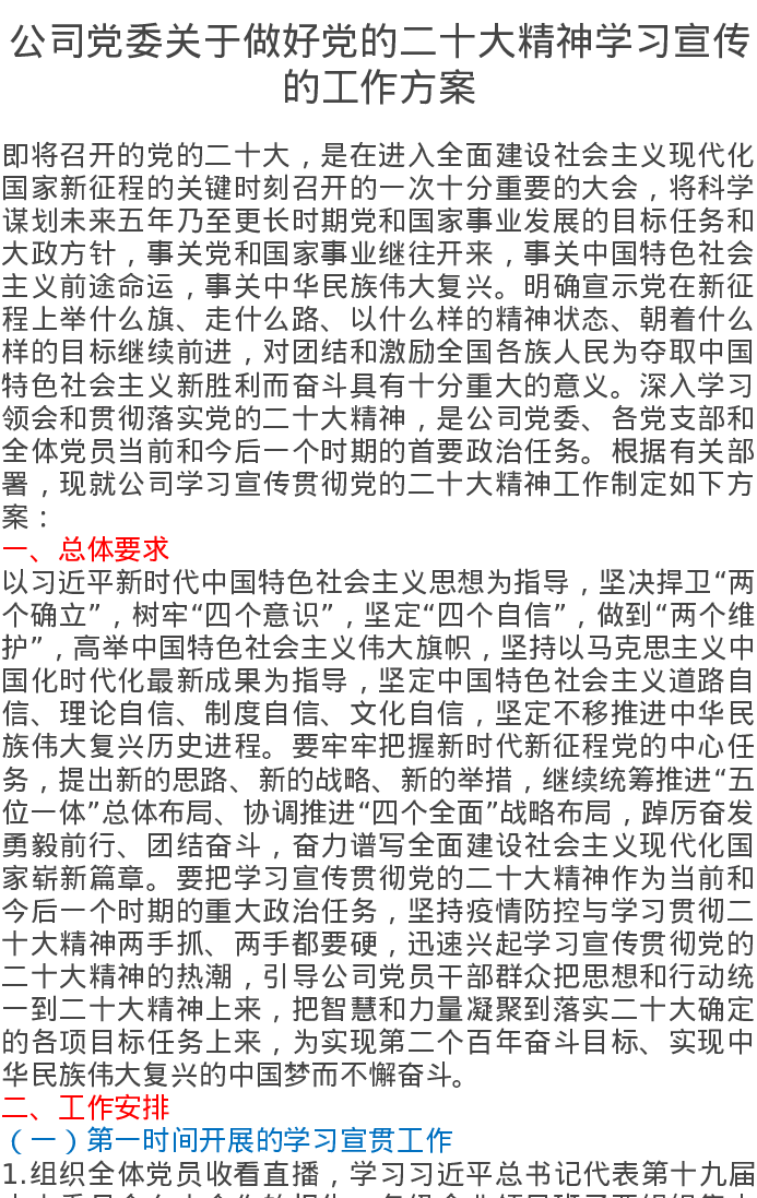 公司党委关于做好党的二十大精神学习宣传的工作方案