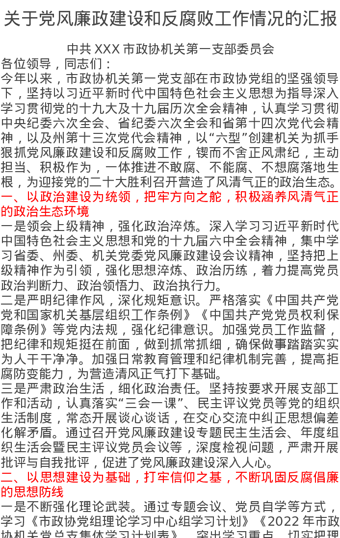 政协关于党风廉政建设和反腐败工作情况的汇报