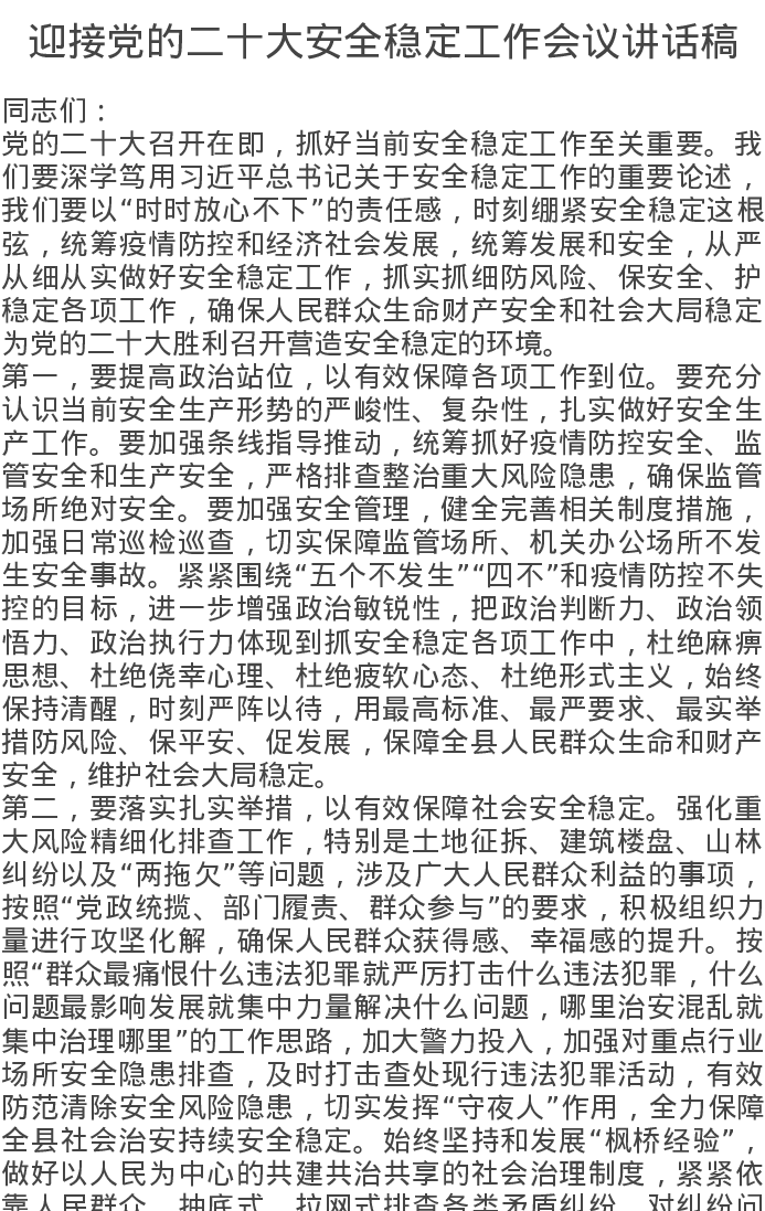 迎接党的二十大安全稳定工作会议讲话稿