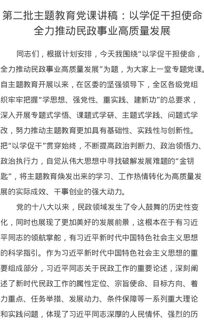 第二批主题教育党课讲稿:以学促干担使命全力推动民政事业高质量发展(特色社会主义思想)