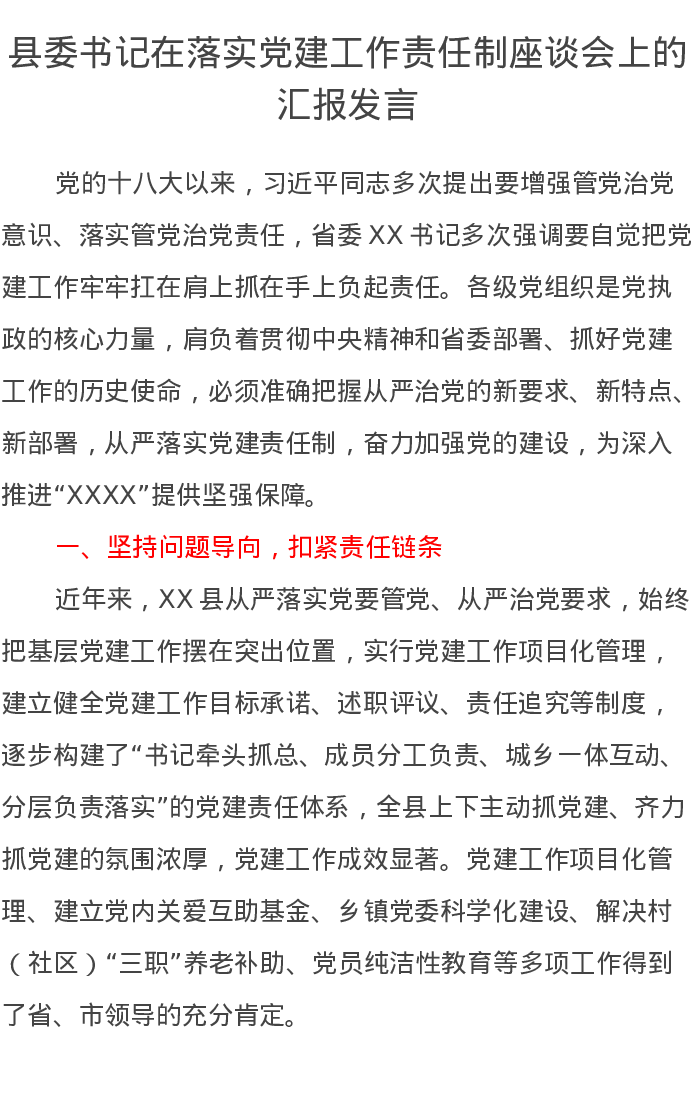 县委书记在落实党建工作责任制座谈会上的汇报发言