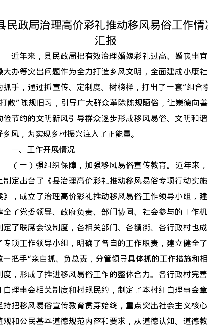 县民政局治理高价彩礼推动移风易俗工作情况汇报