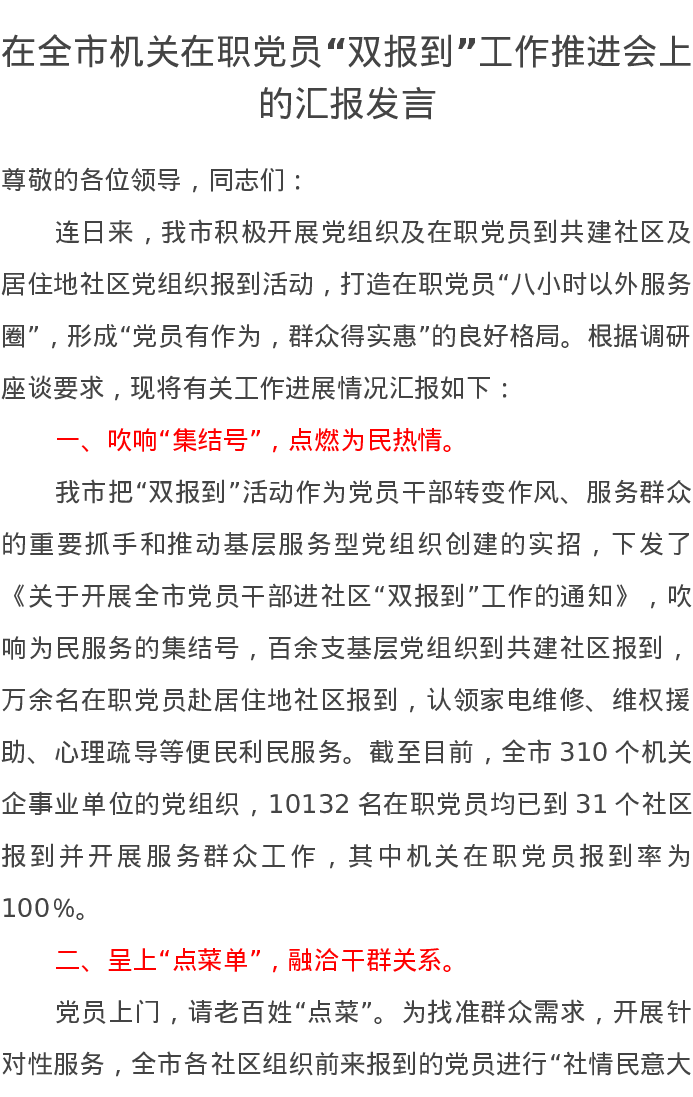 在全市机关在职党员“双报到”工作推进会上的汇报发言