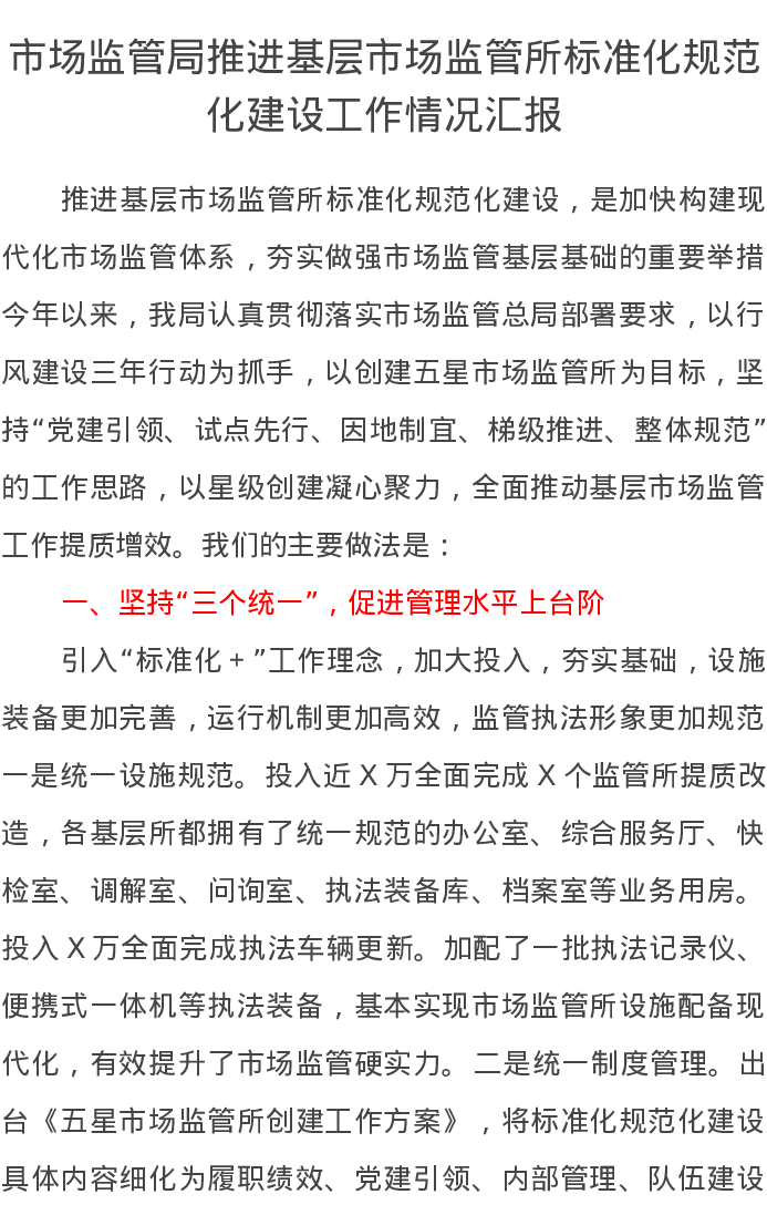 市场监管局推进基层市场监管所标准化规范化建设工作情况汇报