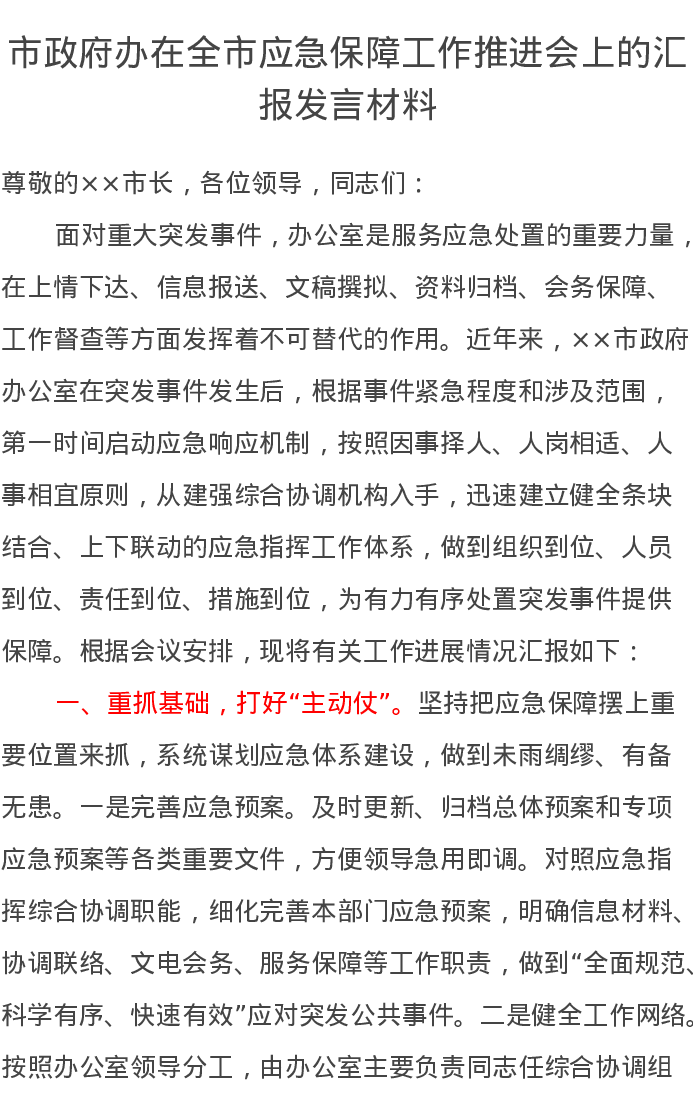 市政府办在全市应急保障工作推进会上的汇报发言材料
