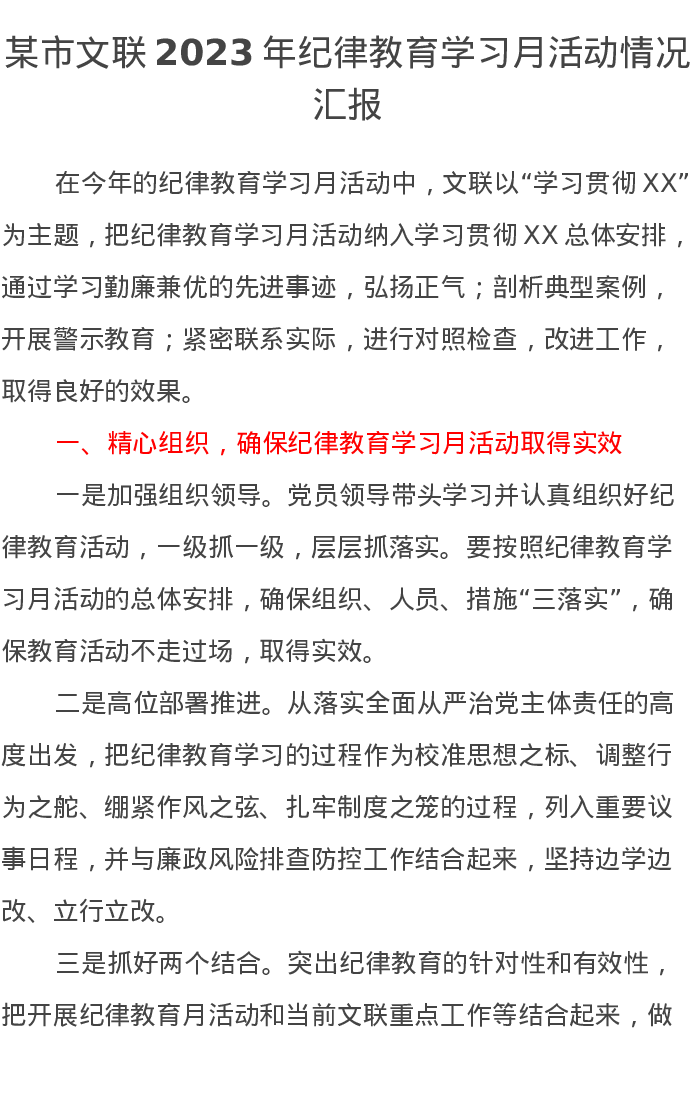 某市文联2023年纪律教育学习月活动情况汇报