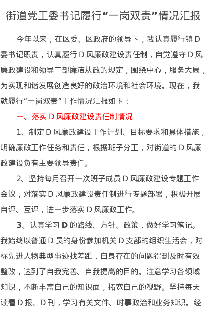 街道党工委书记履行“一岗双责”情况汇报