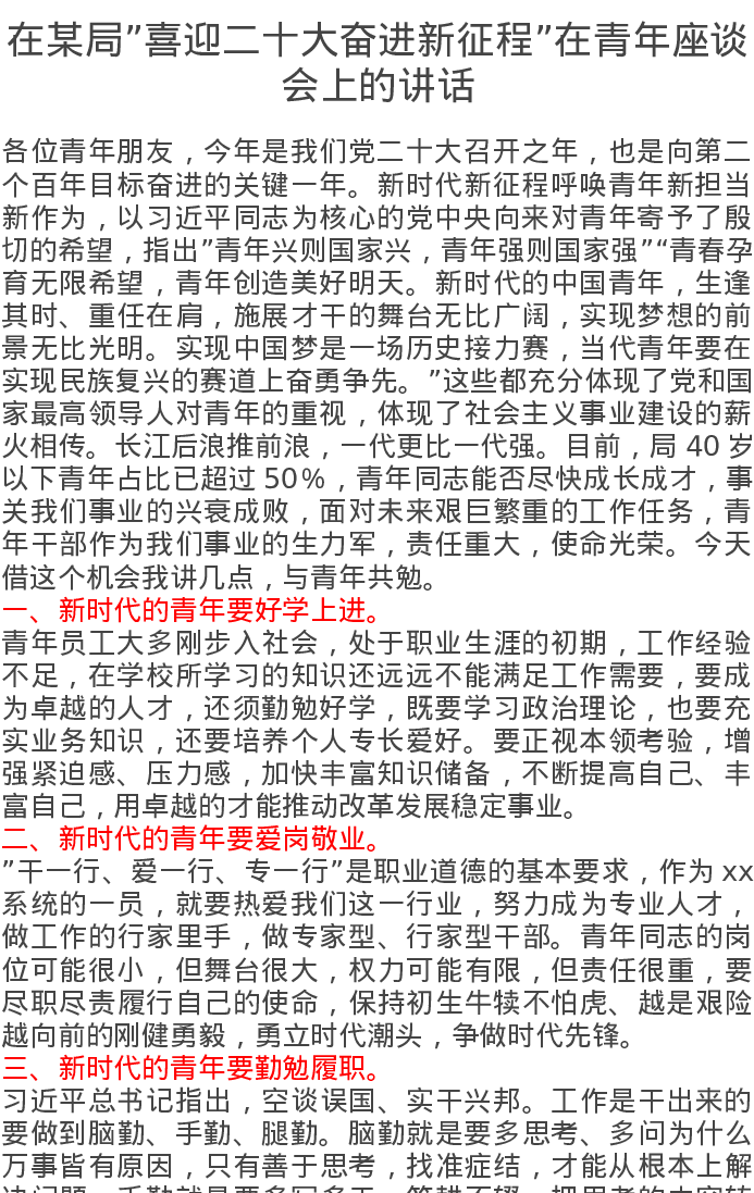 在某局”喜迎二十大奋进新征程”在青年座谈会上的讲话