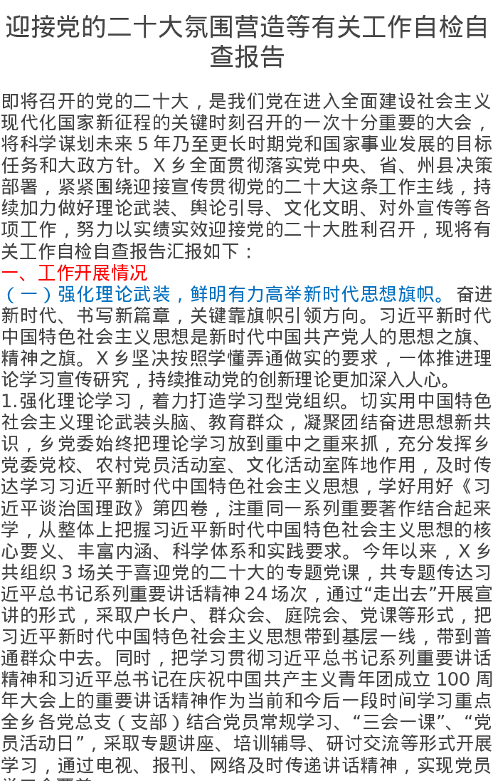 迎接党的二十大氛围营造等有关工作自检自查报告