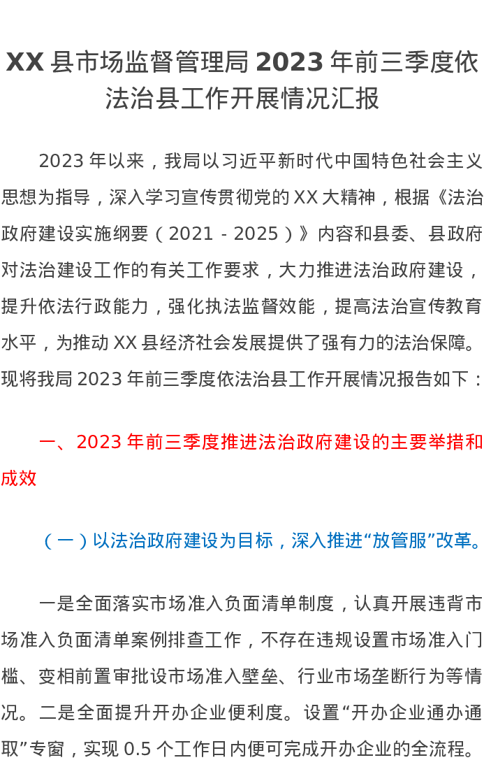 XX县市场监督管理局2023年前三季度依法治县工作开展情况汇报