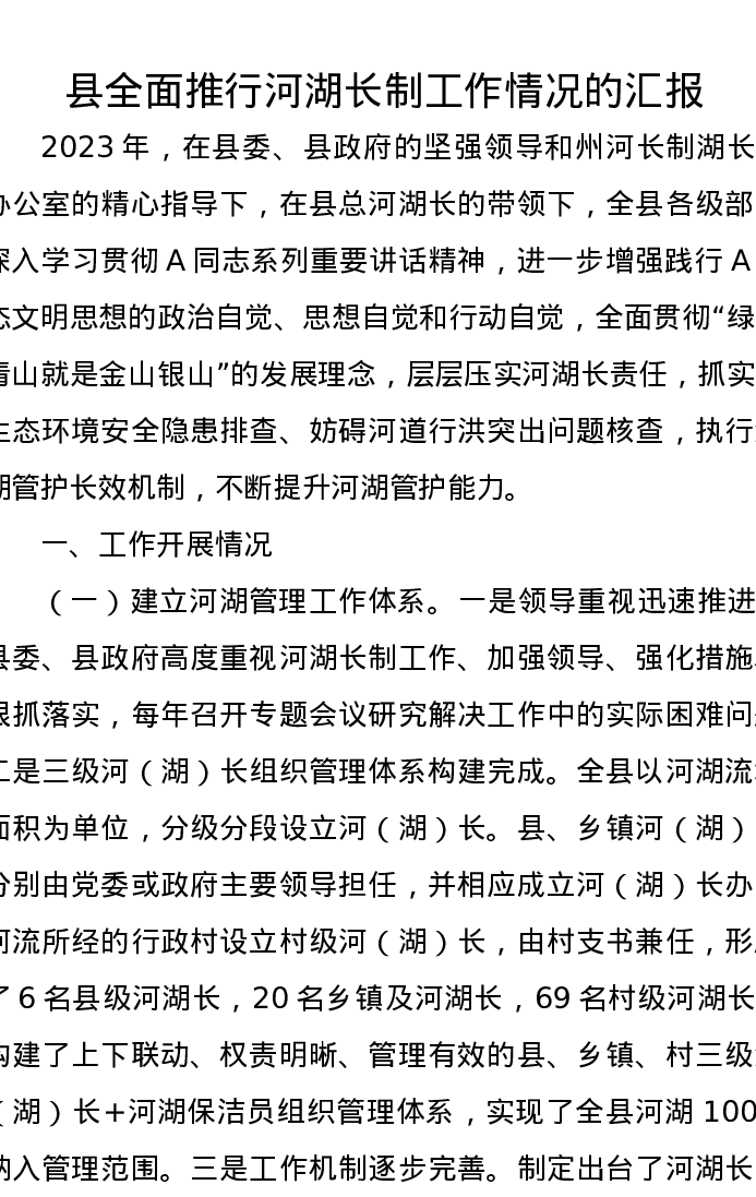 县全面推行河湖长制工作情况的汇报