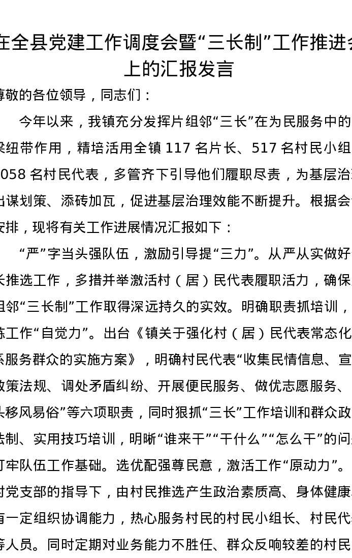 在全县党建工作调度会暨“三长制”工作推进会上的汇报发言