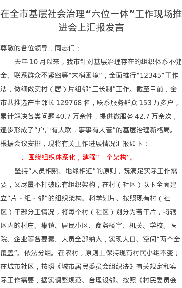 在全市基层社会治理“六位一体”工作现场推进会上汇报发言