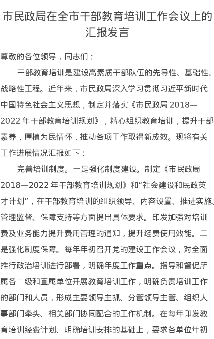 市民政局在全市干部教育培训工作会议上的汇报发言