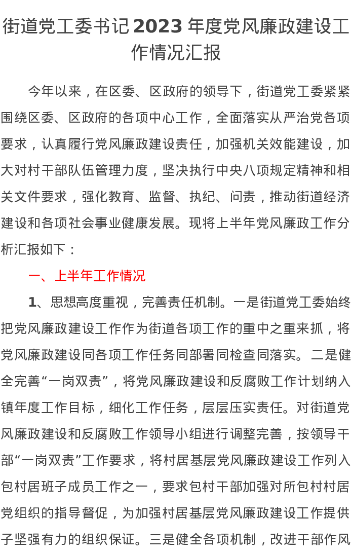 街道党工委书记2023年度党风廉政建设工作情况汇报